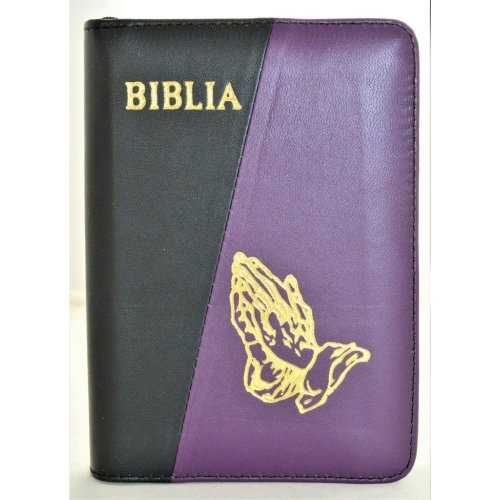 Biblia format mic, din piele, culoare negru / mov inchis, index, fermoar, margini argintii, simbolul maini in ruga, cuv. lui Isus in rosu [047 PFI]