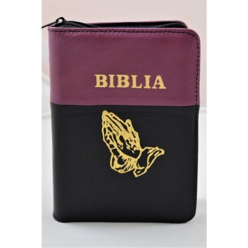Biblia format mic, din piele, culoare negru/mov, index, fermoar, margini argintii, simbolul maini in ruga, cuv. lui Isus in rosu [047 PFI]