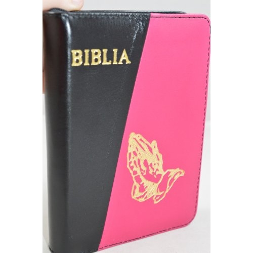 Biblia format mic, din piele, culoare negru/roz bombon, index, fermoar, margini argintii, simbolul maini in ruga, cuv. lui Isus in rosu [047 PFI]