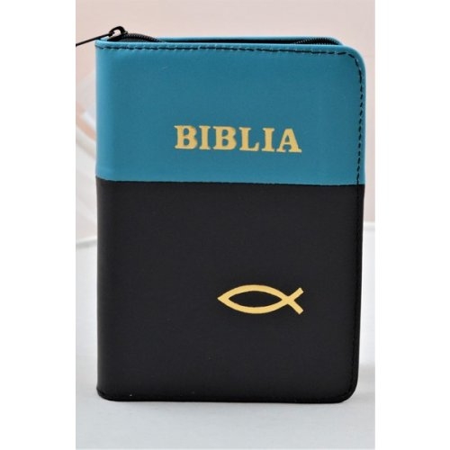 Biblia format mic, din piele, culoare negru/turcoaz, index, fermoar, margini argintii, simbolul peste, cuv. lui Isus in rosu [047 PFI]