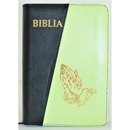Biblia format mic, din piele, culoare negru / verde deschis, index, fermoar, margini argintii,simbolul maini in ruga, cuv. lui Isus in rosu [047 PFI]