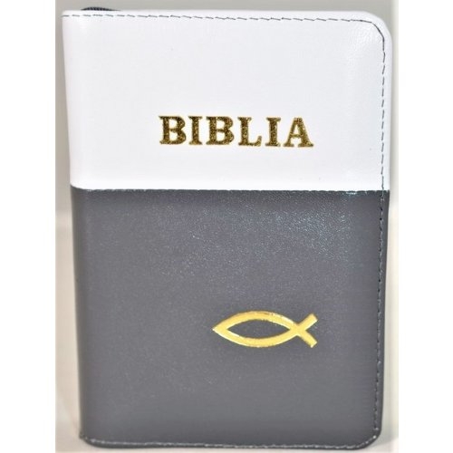 Biblia format mic, din piele, culoare nuanta alb cu gri, index, fermoar, margini argintii, simbolul peste, cuv. lui Isus in rosu [047 PFI]