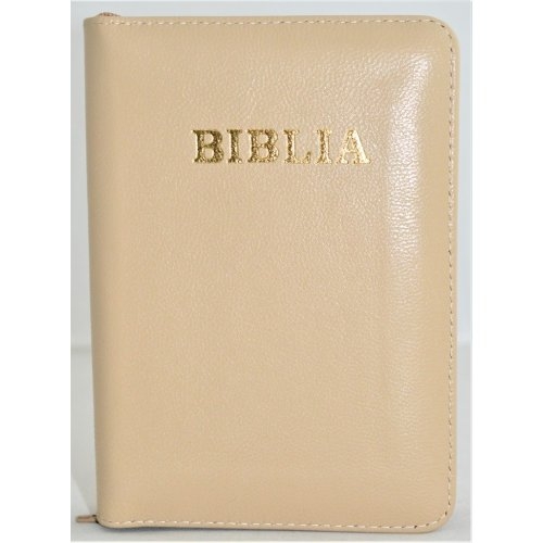 Biblia format mic, din piele, culoare nuanta bej, index, fermoar, margini argintii, cuv. lui Isus in rosu [047 PFI]