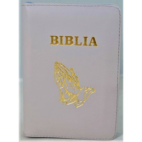 Biblia format mic, din piele, culoare nuanta gri, index, fermoar, margini argintii, simbolul maini in ruga, cuv. lui Isus in rosu [047 PFI]