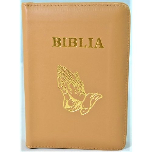 Biblia format mic, din piele, culoare nuanta maro, index, fermoar, margini argintii, simbolul maini in ruga, cuv. lui Isus in rosu [047 PFI]