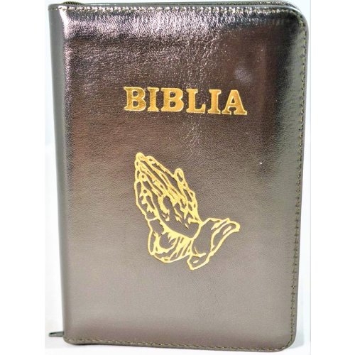 Biblia format mic, din piele, culoare nuanta olive închis sidefat, index, fermoar, margini argintii, simbolul maini in ruga, cuv. lui Isus in rosu [047 PFI]