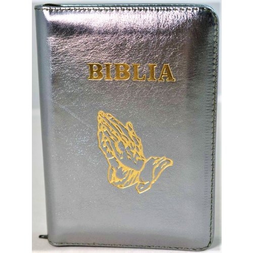 Biblia format mic, din piele, culoare nuanta olive sidefat, index, fermoar, margini argintii, simbolul maini in ruga, cuv. lui Isus in rosu [047 PFI]