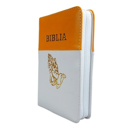 Biblia format mic, din piele, culoare portocaliu cu alb, index, fermoar, margini argintii, simbol maini in rugaciune, cuv. lui Isus in rosu [047 PFI]