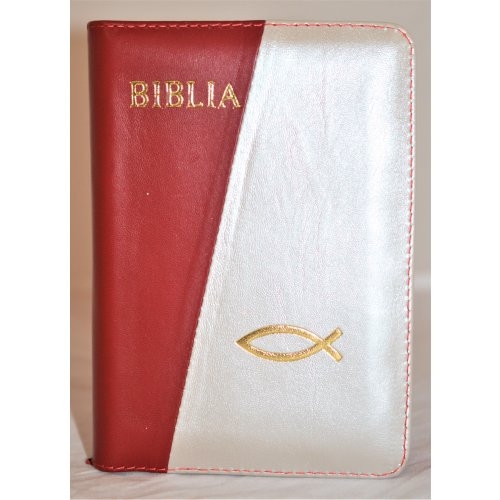 Biblia format mic, din piele, culoare rosie / gri sidefat, index, fermoar, margini argintii, simbolul peste, cuv. lui Isus in rosu [047 PFI]
