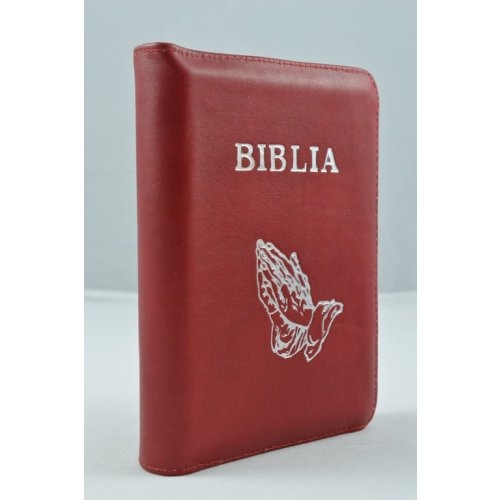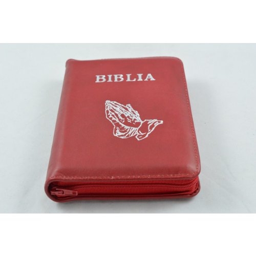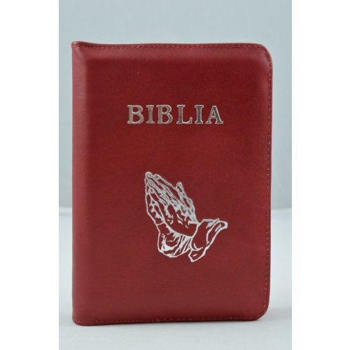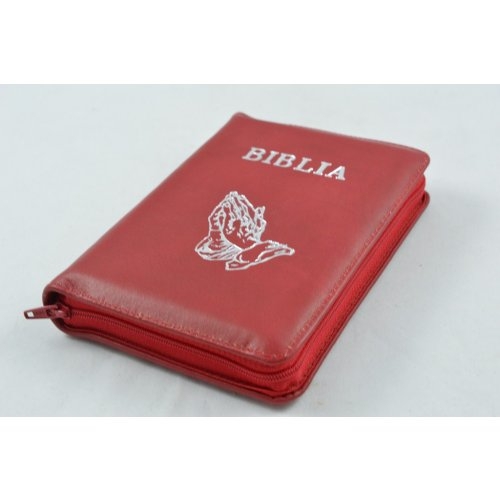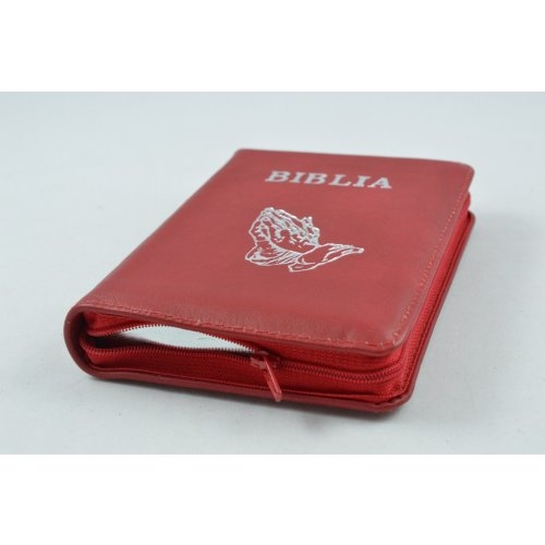 Biblia format mic, din piele, culoare rosie, index, fermoar, margini argintii, cu maini in ruga, cuv. lui Isus in rosu [047 PFI]