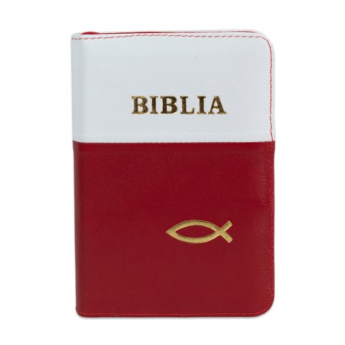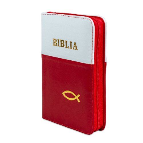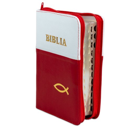 Biblia format mic, din piele, culoare rosu cu alb, dex, fermoar, margini argintii, simbol cu peste, cuv. lui Isus in rosu [047 PFI]