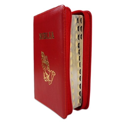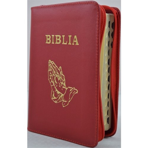 Biblia format mic, din piele, culoare rosu inchis, index, fermoar, simbol maini, margini argintii, cuv. lui Isus in rosu [047 PFI]
