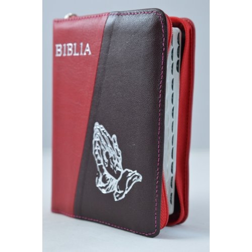 Biblia format mic, din piele, culoare rosu inchis - maro brun, index, fermoar, margini argintii, simbol maini in ruga, cuv. lui Isus in rosu [047 PFI]