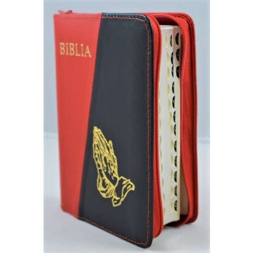 Biblia format mic, din piele, culoare rosu/negru, index, fermoar, margini aurii, cu maini in ruga, cuv. lui Isus in rosu [047 PFI]