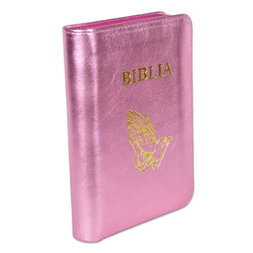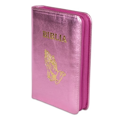 Biblia format mic, din piele, culoare roz bombon sidefat, index, fermoar, margini argintii, simbolul maini in ruga, cuv. lui Isus in rosu [047 PFI]