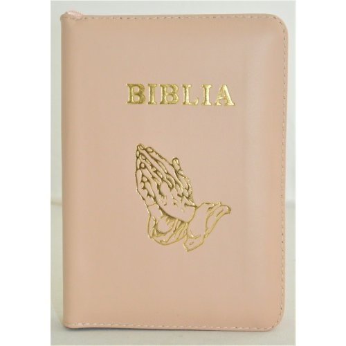 Biblia format mic, din piele, culoare roz capucin, index, fermoar, margini argintii, simbolul maini in ruga, cuv. lui Isus in rosu [047 PFI]