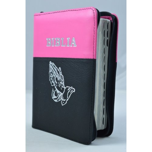 Biblia format mic, din piele, culoare roz ciclam - negru, index, fermoar, margini argintii, simbol maini in ruga, cuv. lui Isus in rosu [047 PFI]