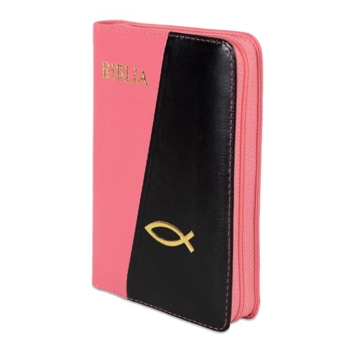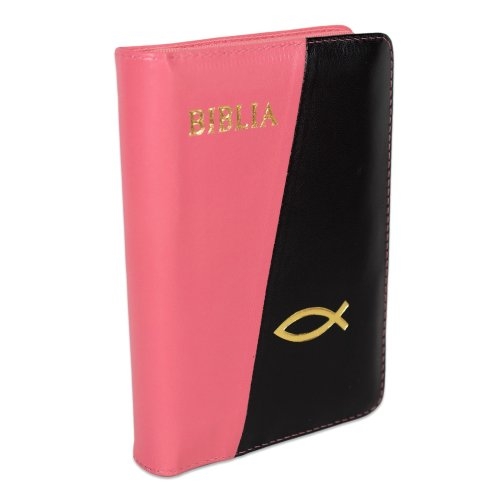 Biblia format mic, din piele, culoare roz cu negru, index, fermoar, margini argintii, simbol peste, cuv. lui Isus in rosu [047 PFI]