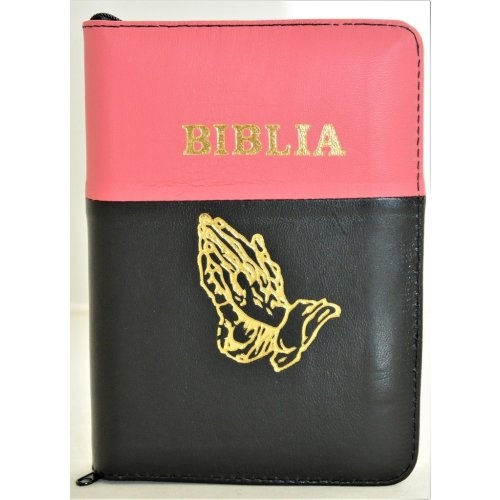 Biblia format mic, din piele, culoare roz cu negru, index, fermoar, margini argintii, simbolul maini in ruga, cuv. lui Isus in rosu [047 PFI]