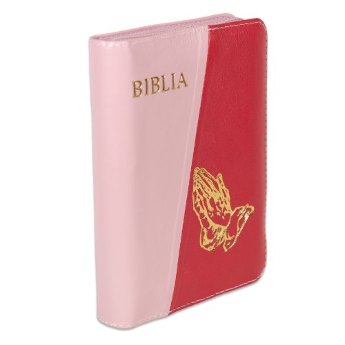 Biblia format mic, din piele, culoare roz cu roz inchis, dex, fermoar, margini argintii, simbolul maini in rugaciune, cuv. lui Isus in rosu [047 PFI]