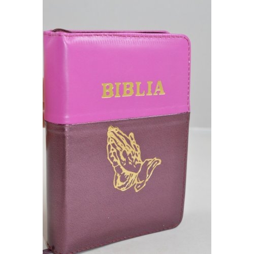 Biblia format mic, din piele, culoare roz cu visiniu sidefat, index, fermoar, margini argintii, simbolul maini in ruga, cuv. lui Isus in rosu [047 PFI]
