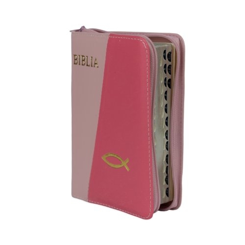 Biblia format mic, din piele, culoare, roz deschis cu roz închis, index, fermoar, margini argintii, cuv. lui Isus in rosu [047 PFI]