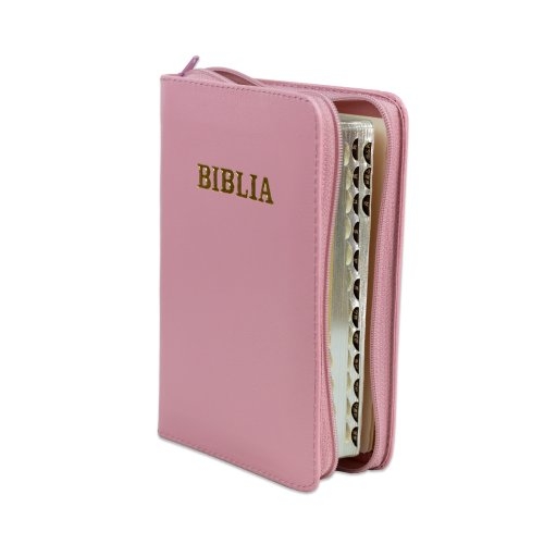 Biblia format mic, din piele, culoare roz deschis, index, fermoar, margini argintii, cuv. lui Isus in rosu [047 PFI]