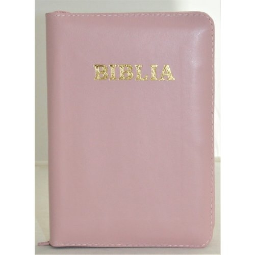 Biblia format mic, din piele, culoare roz deschis, index, fermoar, margini argintii, cuv. lui Isus in rosu [047 PFI]