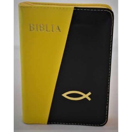 Biblia format mic, din piele, culoare galben -negru, index, fermoar, margini argintii, simbolul peste, cuv. lui Isus in rosu [047 PFI]