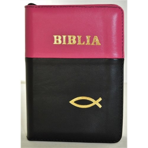 Biblia format mic, din piele, culoare roz inchis cu negru, index, fermoar, margini argintii, simbolul peste, cuv. lui Isus in rosu [047 PFI]