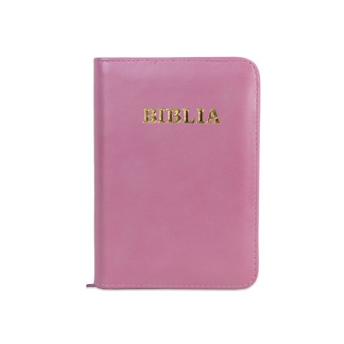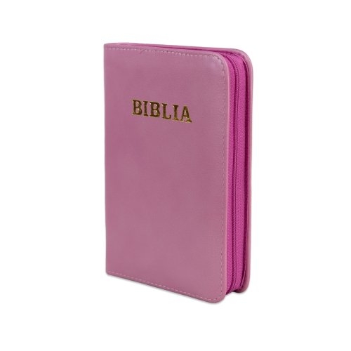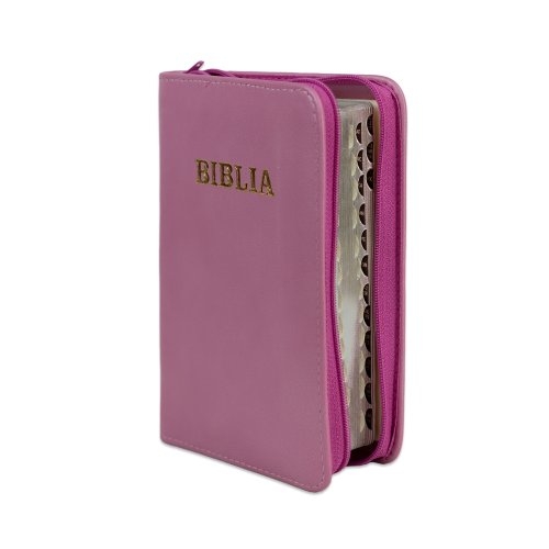 Biblia format mic, din piele, culoare roz, index, fermoar, margini argintii, cuv. lui Isus in rosu [047 PFI]