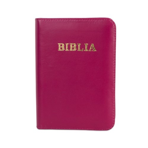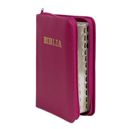 Biblia format mic, din piele, culoare roz magenta, index, fermoar, margini argintii, cuv. lui Isus in rosu [047 PFI]
