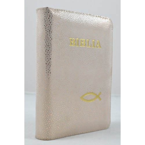 Biblia format mic, din piele, culoare roz pal cu imprimeu auriu, index, fermoar, margini argintii,simbolul peste, cuv. lui Isus in rosu [047 PFI]