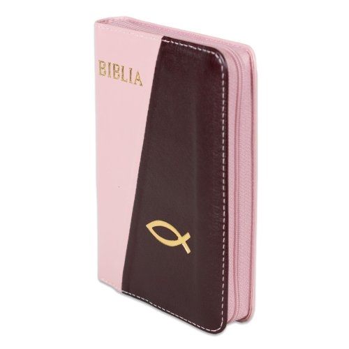 Biblia format mic, din piele, culoare roz pal cu maro inchis, dex, fermoar, margini argintii, simbol peste, cuv. lui Isus in rosu [047 PFI]