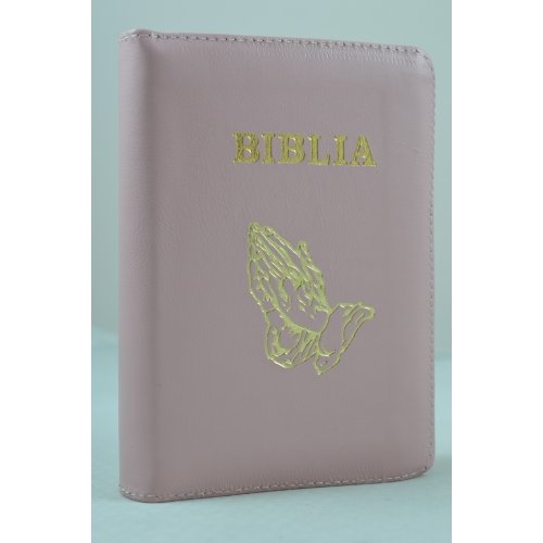Biblia format mic, din piele, culoare roz pal, index, fermoar, margini argintii, cu maini in ruga cuv. lui Isus in rosu [047 PFI]