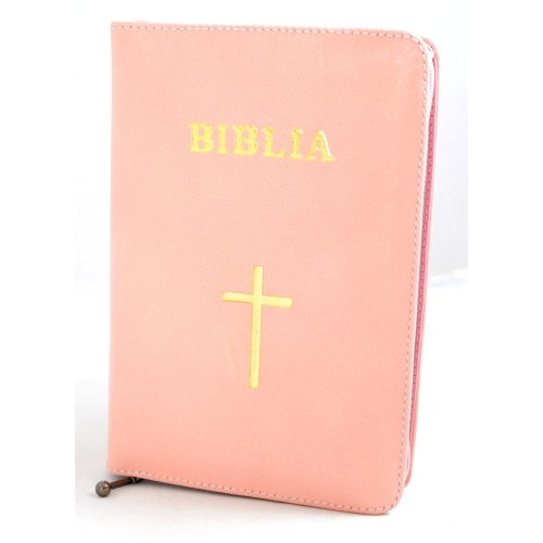 Biblia format mic, din piele, culoare roz pal, index, fermoar, margini argintii, simbol cruce, cuv. lui Isus in rosu [047 PFI]