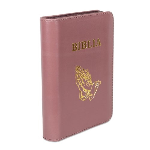 Biblia format mic, din piele, culoare roz plamaniu, index, fermoar, margini argintii, simbolul maini in ruga, cuv. lui Isus in rosu [047 PFI]