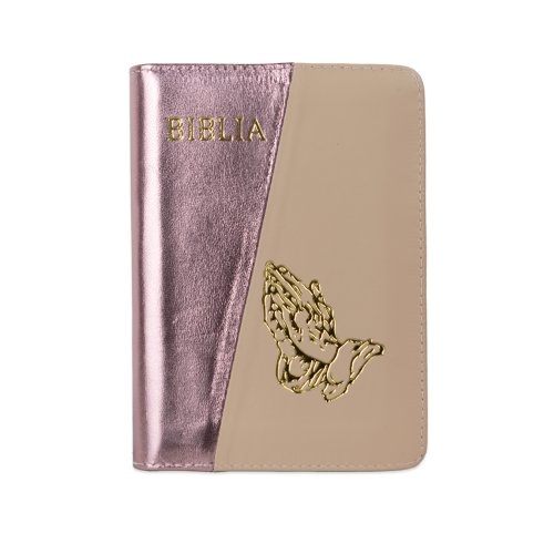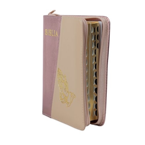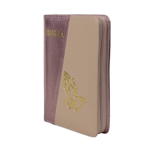 Biblia format mic, din piele, culoare, roz sidefat cu bej deschis, index, simbol maini, fermoar, margini argintii, cuv. lui Isus in rosu [047 PFI]