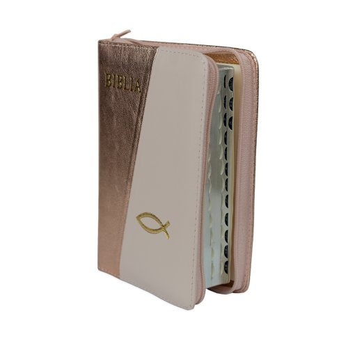 Biblia format mic, din piele, culoare, roz sidefat cu roz pal, index, fermoar, margini argintii, cuv. lui Isus in rosu [047 PFI]