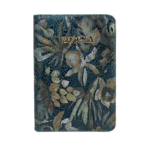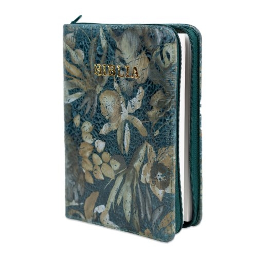 Biblia format mic, din piele, culoare, verde cu model floral, index, fermoar, margini argintii, cuv. lui Isus in rosu [047 PFI]