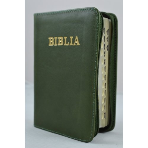 Biblia format mic, din piele, culoare verde inchis, index, fermoar, margini argintii, cuv. lui Isus in rosu [047 PFI]