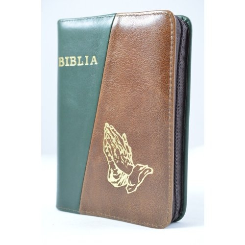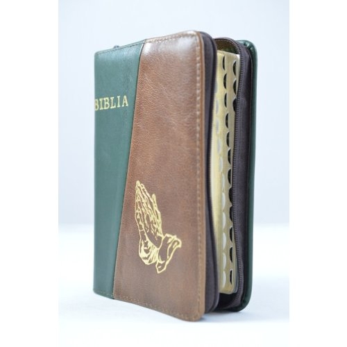 Biblia format mic, din piele, culoare verde / maro, index, fermoar, margini aurii, simbol - maini in ruga, cuv. lui Isus in rosu [047 PFI]