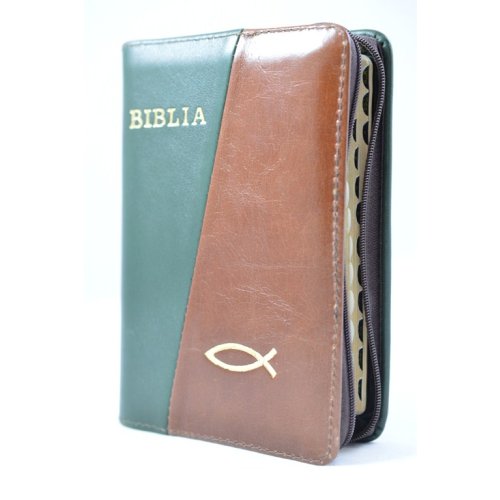 Biblia format mic, din piele, culoare verde / maro, index, fermoar, margini aurii, simbol - peste, cuv. lui Isus in rosu [047 PFI]