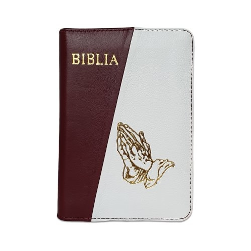 Biblia format mic, din piele, culoare visiniu/alb, index, fermoar, margini argintii, cu maini in ruga cuv. lui Isus in rosu [047 PFI]