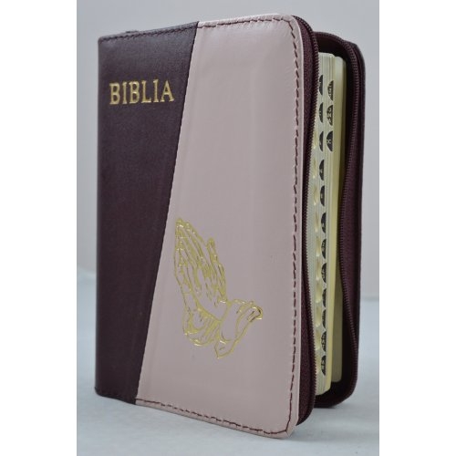 Biblia format mic, din piele, culoare visiniu inchis/roz pal , index, fermoar, margini argintii, cu maini in ruga cuv. lui Isus in rosu [047 PFI]