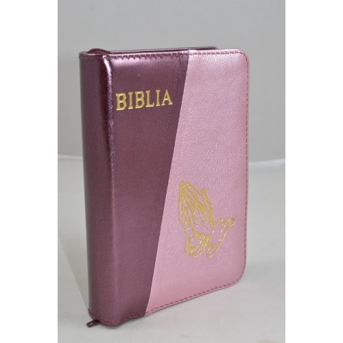 Biblia format mic, din piele, culoare visiniu sidefat/roz sidefat, index, fermoar, margini argintii, simbolul maini in ruga, cuv. lui Isus in rosu [047 PFI]