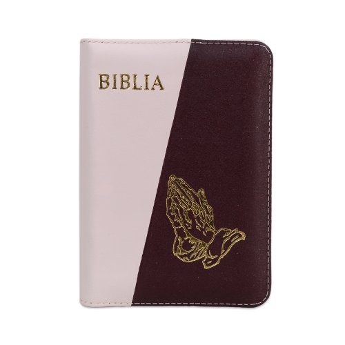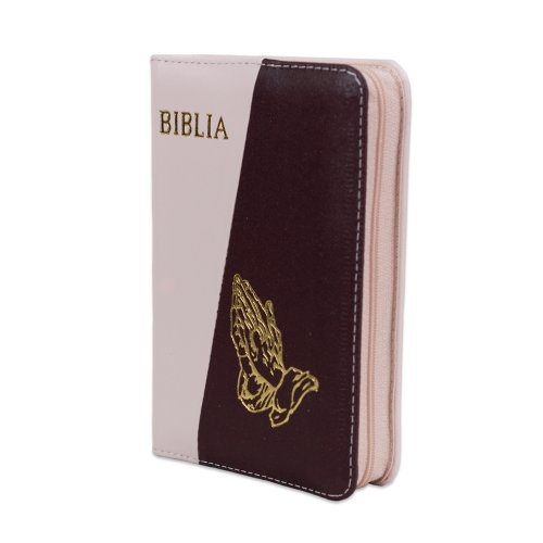 Biblia format mic, din piele, roz cu vișiniu, index, fermoar, margini argintii, simbol maini, cuv. lui Isus in rosu [047 PFI]