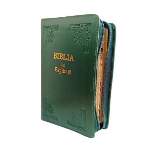 Biblia handmade, cu concordanta si explicatii, marime mare, piele, culoare verde iarba, fermoar, index, margini aurii, cuv. lui Isus cu rosu [CO 77 HMI]