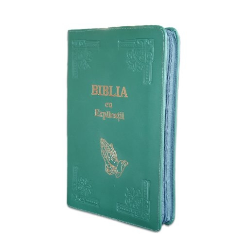 Biblia handmade, cu concordanta si explicatii, marime mare, piele, culoare verde iarba, fermoar, index, margini aurii, simbol maini in rugaciune, cuv. lui Isus cu rosu [CO 77 HMI]