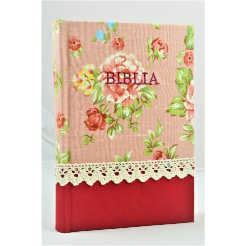 Biblia handmade, marime medie, coperta cartonata textila, model floral rosu, margini aurii [SI 052 HM]